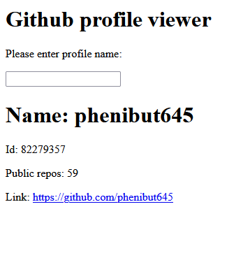 On loodud leht mis teeb päringu GitHubi ja näitab valiku infot (ID, repos number, viit repos)